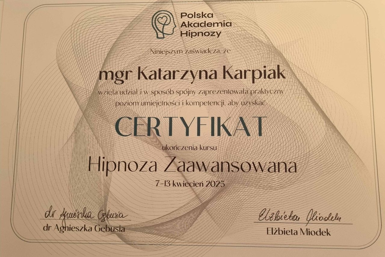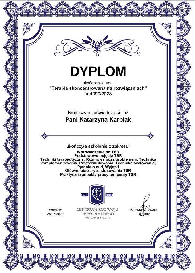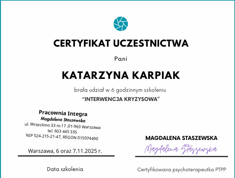Swoją wiedzę stale pogłębia poprzez udział w szkoleniach, warsztatach oraz swoją pracę poddaje regularnej superwizji.