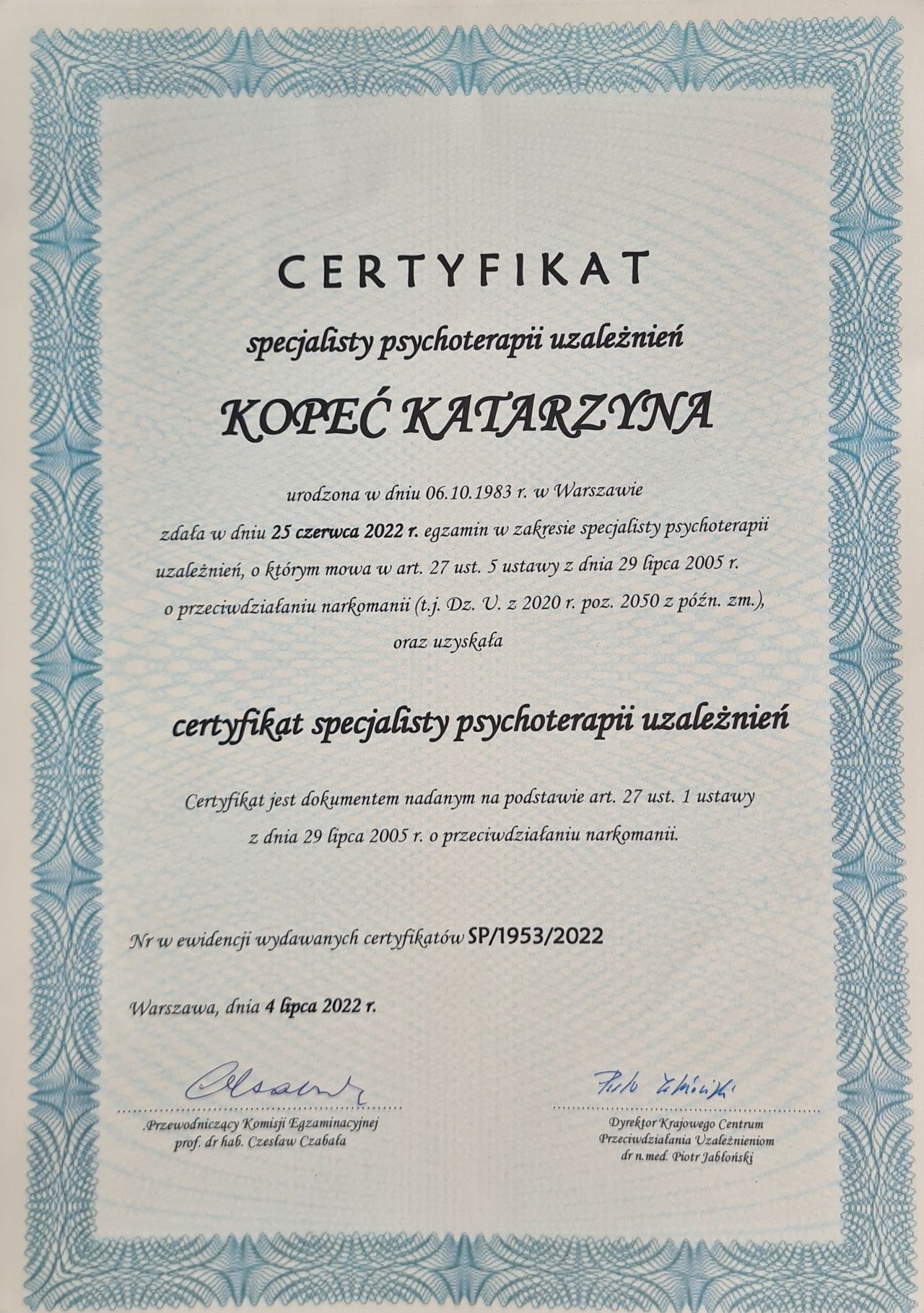 Z wykształcenia jestem psychologiem i specjalistką psychoterapii uzależnień o certyfikacie nr SP/1953/2022