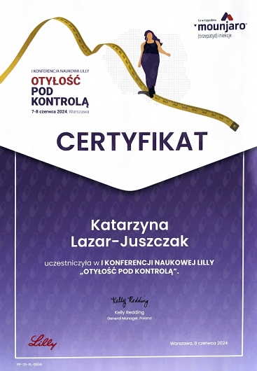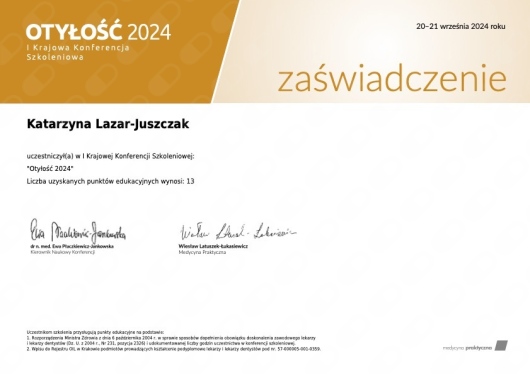 - Certyfikat profesjonalnego leczenia nadwagi i otyłości w ramach Ogólnopolskiego Programu Certyfikacji i Akredytacji prowadzonego przez Polskie Towarzystwo Leczenia Otyłości (2023)