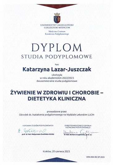 - Studia podyplomowe „Żywienie w zdrowiu i chorobie – dietetyka kliniczna” Uniwersytet Jagielloński Collegium Medicum w Krakowie (2022-2023)
