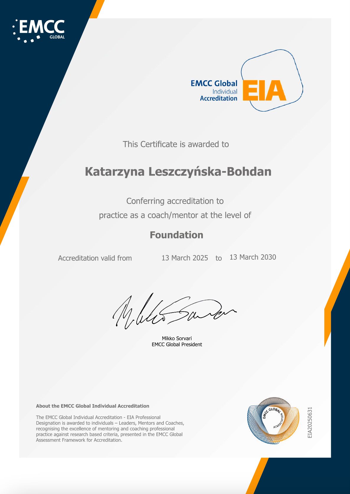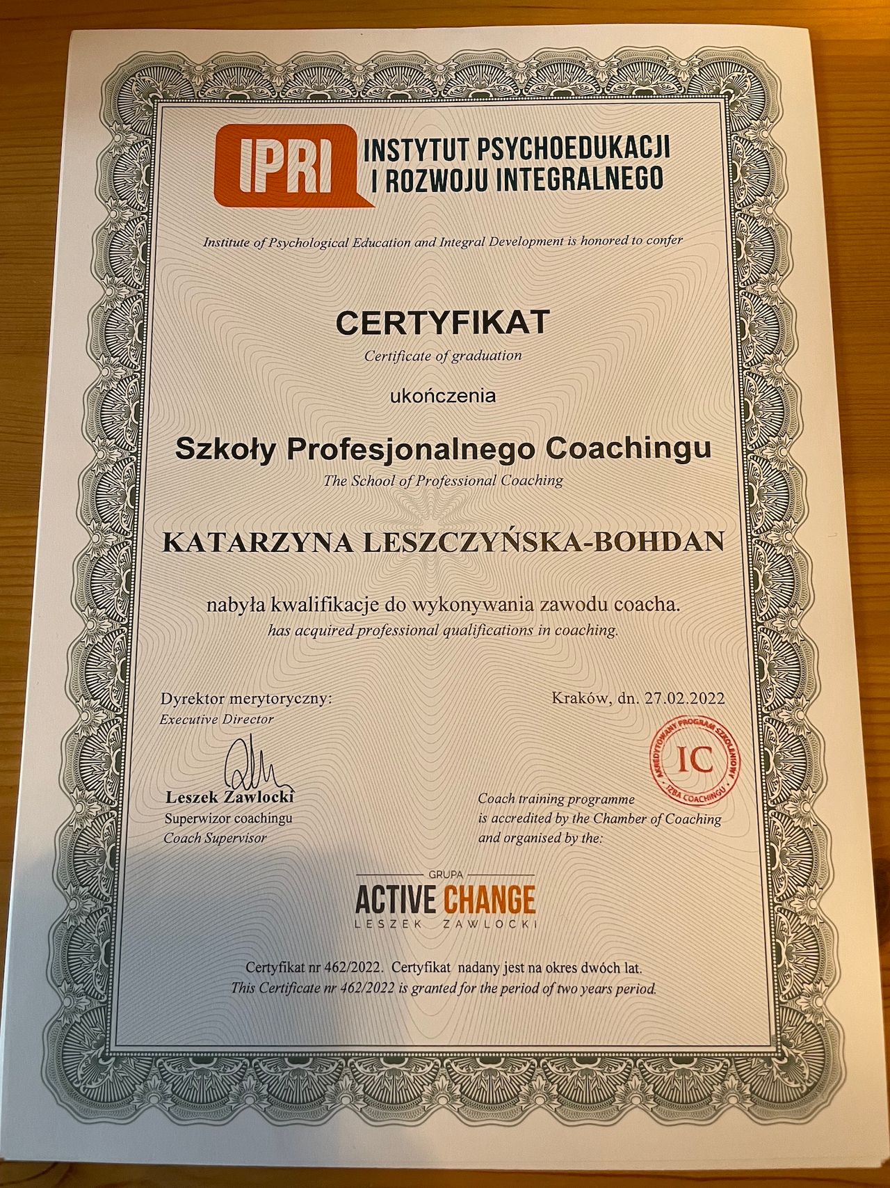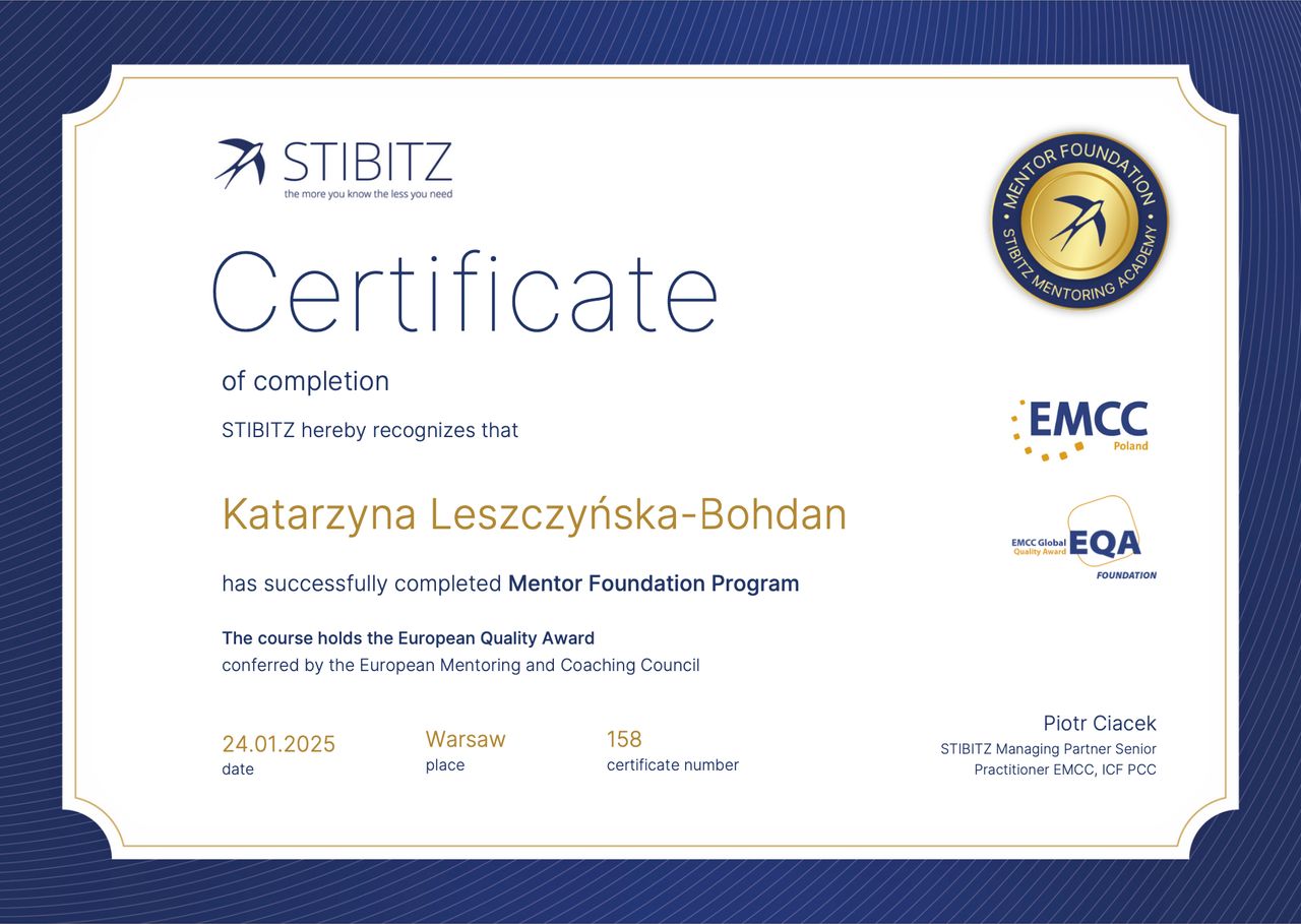 Ukończyłam studia psychologiczne na Uniwersytecie Łódzkim i Jagiellońskim oraz podyplomową Szkołę Profesjonalnego Coachingu w Instytucie Psychoedukacji i Rozwoju Integralnego. Uzyskałam także akredytację coacha i mentora EIA EMCC.