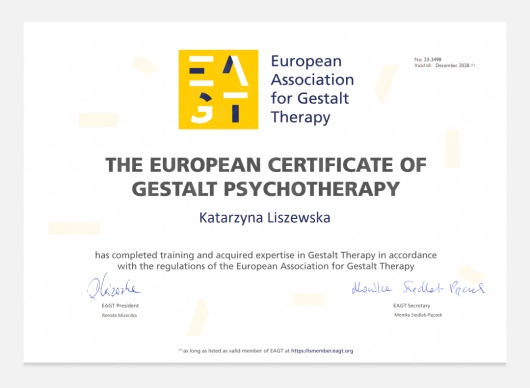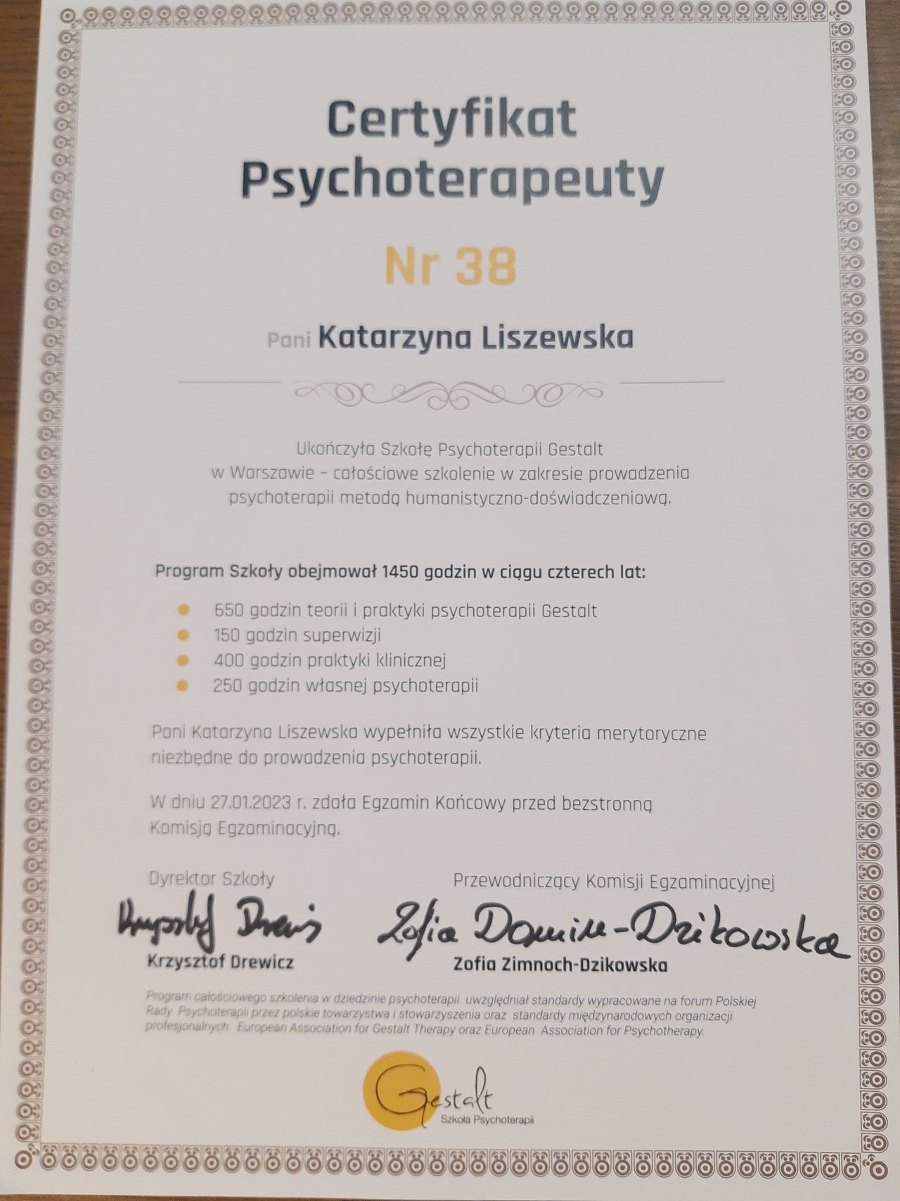 Jestem pedagogiem i certyfikowaną psychoterapeutką, pracującą w nurcie Gestalt. Ukończyłam studia pedagogiczne na Uniwersytecie Wrocławskim o specjalności poradnictwo rodzinne i zawodowe, a także 4 - letnią Szkołę Psychoterapii Gestalt w Warszawie zakończoną certyfikacją w European Association for Gestalt Therapy (EAGT). Ponadto zrealizowałam całościowe szkolenie - Studium Terapii Par i Małżeństw w ramach Wielkopolskiego Instytutu Psychoterapii oraz poszerzam dalej swoje kompetencje uczestnicząc w szkoleniach z zakresu pracy terapeutycznej z klientem. Prowadzę konsultacje i sesje psychoterapeutyczne w gabinecie we Wrocławiu oraz online. Pracuję z osobami dorosłymi w procesach indywidualnych, jak i w ramach terapii par i małżeństw. Do podjęcia psychoterapii, szczególnie zapraszam osoby doświadczające: - trudności w odnalezieniu rozwiązań swoich problemów, - niskiej samooceny, braku wiary w siebie i swoje możliwości, - trudności w adaptacji do zmian i nowych warunków, - poczucia ciągłego stresu, przemęczenia, przepracowania, - trudności w wyrażaniu swoich emocji, - wypalenia, w tym wypalenia zawodowego, - poczucia braku motywacji i/lub sensu życia, - utraty bliskiej osoby, - długotrwałego smutku, - trudności z zapanowaniem nad złością, - poczucia zagubienia, bezradności, - samotności, - trudności w relacjach z bliskimi lub kontaktach społecznych, - stanów lękowych, poczucia ciągłego niepokoju, - kłopotów w związku lub jego rozpadu. W trakcie terapii skupiam się przede wszystkim na jakości relacji terapeuta – klient. Moim celem jest wsparcie w poszerzaniu samoświadomości klienta i odnalezieniu jego osobistego potencjału. W trosce o dobro swoje i swoich klientów pracuję w oparciu o wytyczne Kodeksu Etycznego Polskiego Towarzystwa Psychoterapii Gestalt a swoją pracę poddaje regularnej superwizji.