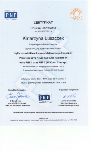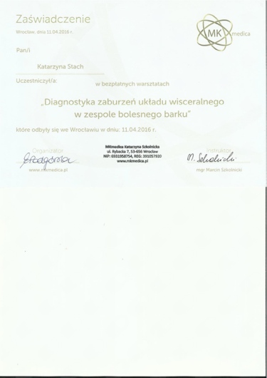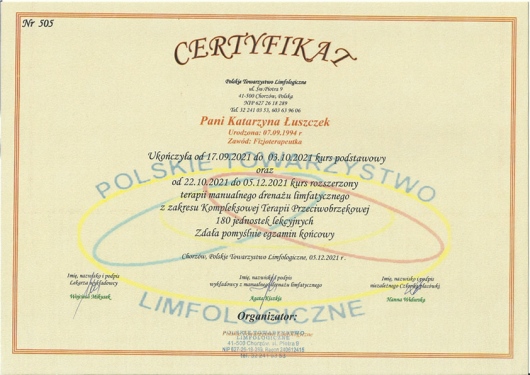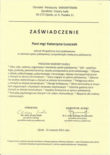 Ukończyłam wiele specjalistycznych szkoleń podyplomowych, pracowałam na szpitalnych oddziałach OIOM, neurologia, ortopedia, podnosząc tym samym swoje kwalifikacje.