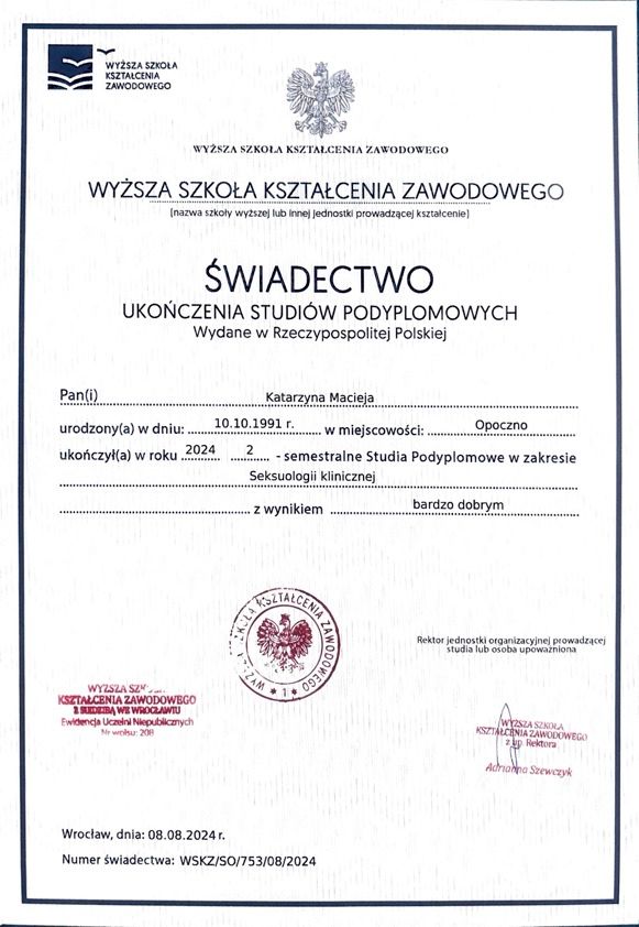 Czy Katarzyna Macieja przyjmuje online, bez konieczności pojawiania się w placówce?Tak, Katarzyna Macieja oferuje konsultacje online. Wybierz opcję „konsultacja online” przy umawianiu wizyty, a zobaczysz dostępne terminy.
