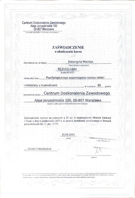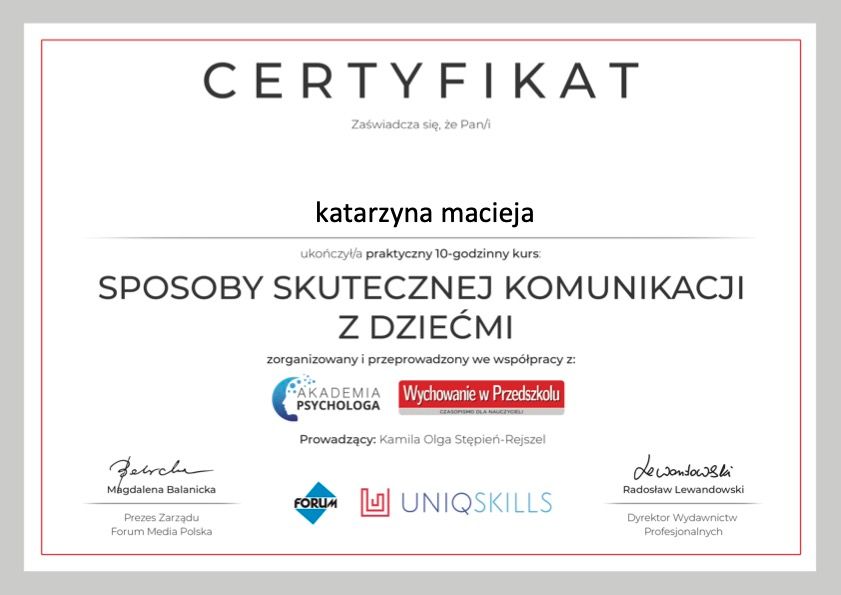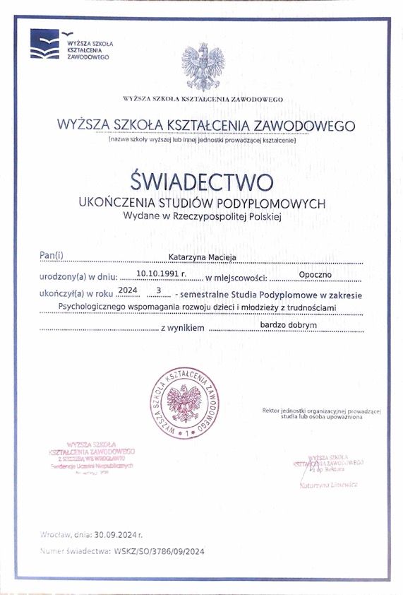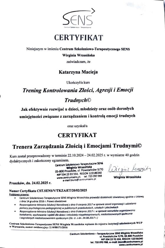 Wszystkim którzy się wahają mogę polecić absolutnie w ciemno Panią Katarzynę. - OGROMNA empatia, - powołanie i chęć pomocy które czuć i widać zarówno w ludzkim podejściu, jak i profesjonalizmie, - czu...