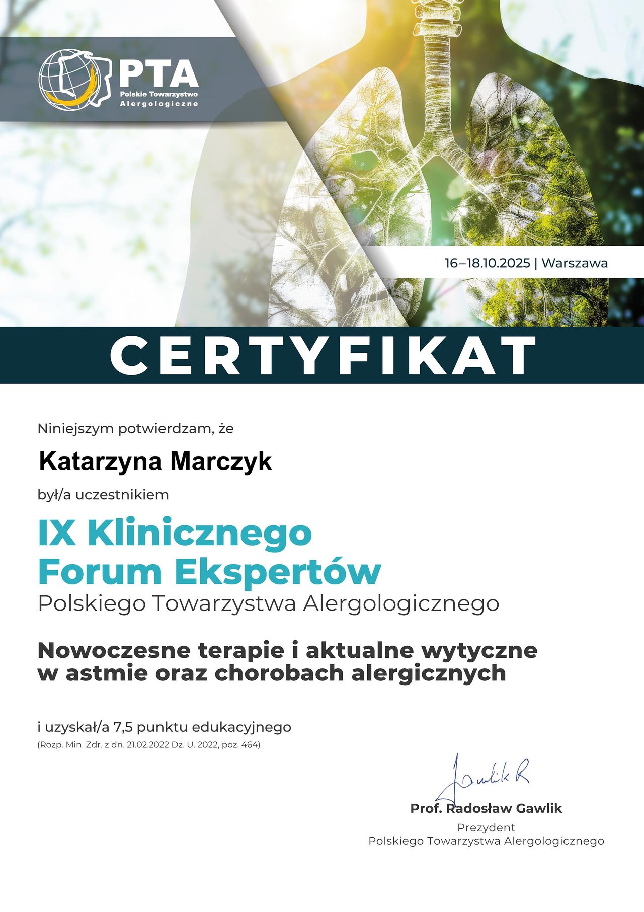 Lek. Katarzyna Marczyk ukończyła Wydział Wojskowo-Lekarski Uniwersytetu Medycznego w Łodzi z wynikiem bardzo dobrym oraz Wyższą Szkołę Oficerską Wojsk Lądowych we Wrocławiu.