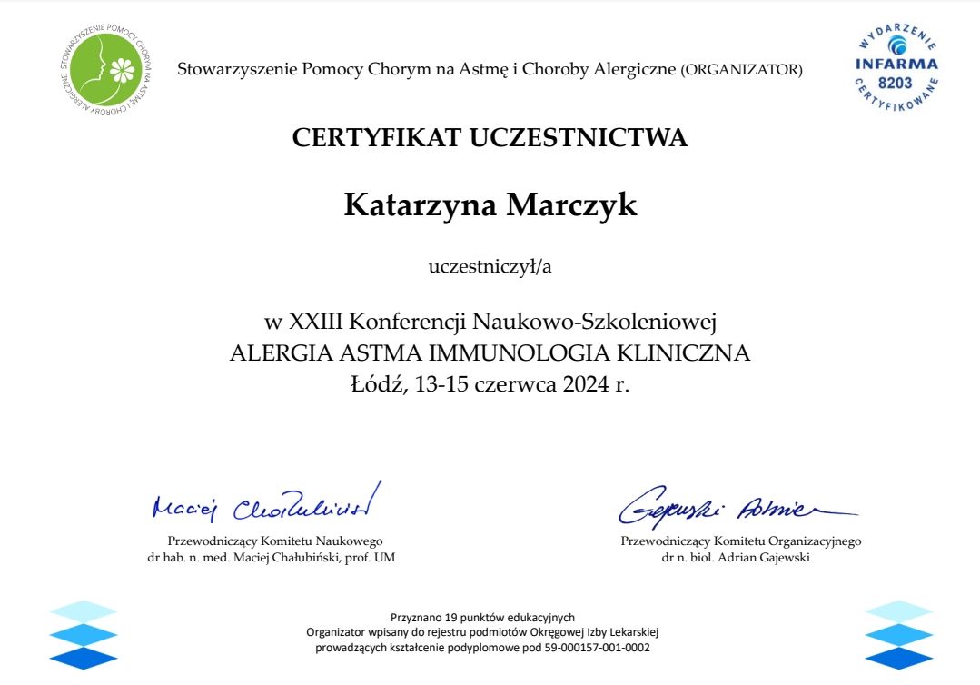 Obecnie jest w trakcie specjalizacji w dziedzinie alergologii w Klinice Chorób Wewnętrznych, Pneumonologii, Alergologii, Immunologii Klinicznej i Chorób Rzadkich Wojskowego Instytutu Medycznego CSK MON w Warszawie.