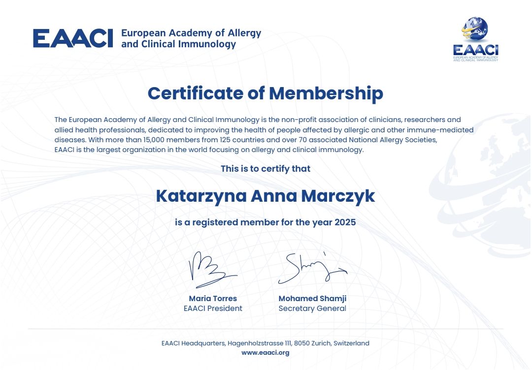 W kwietniu 2025 zdała Państwowy Egzamin Specjalizacyjny z Alergologii z wynikiem dobrym (3 wynik w Polsce ze zwolnieniem z egzaminu ustnego). Oficer WP w stopniu kapitana. Członkini Polskiego Towarzystwa Alergologicznego oraz European Academy of Allergy & Clinical Immunology, uczestniczka licznych konferencji naukowych krajowych i zagranicznych.