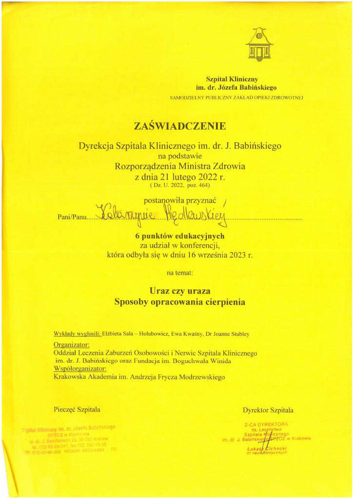 W trosce o standard pracy kieruję się Kodeksem Etycznym Psychoterapeutów SNP PTP co oznacza m.in., że korzystam z regularnej superwizji, dbam o podnoszenie kwalifikacji, odbyłam własną psychoterapię.