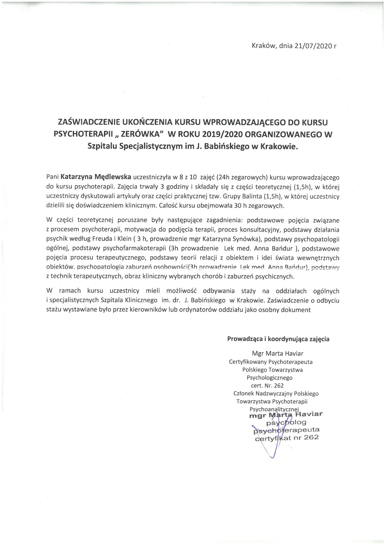 Doświadczenie zdobywałam także podczas pracy w Domu Pomocy Społecznej dla Dorosłych w Bytomiu, staży klinicznych ( Oddział Leczenia Zaburzeń Osobowości i Nerwic 7F w Kobierzynie, Oddział Dzienny Psychiatryczny w WSS4 w Bytomiu),a także wolontariatu (HelpPsyche- Online, Stowarzyszenie Rodzin Osób Niepełnosprawnych Nadzieja w Rudzie Śląskiej) i praktyk studenckich (Samodzielny Publiczny Zespół Lecznictwa Psychiatrycznego w Siemianowicach Śląskich- Oddział Dzienny Psychiatryczny).