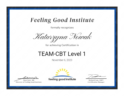ENG: I'm a dedicated psychologist currently deepening my expertise in Cognitive Behavioral Therapy (CBT) at Crescentia School of Psychotherapy. In addition to this, I have achieved a Level 1 TEAM-CBT Therapist Certification from the Feeling Good Institute - an American institute specializing in therapy and professional development for mental health professionals. In my pursuit of knowledge and skills enhancement, I have participated in additional training in such areas as the use of CBT tools for quick recovery from social anxiety insomnia, as well as courses on aiding people with depression. My work undergoes regular supervision, ensuring I offer the best possible support.