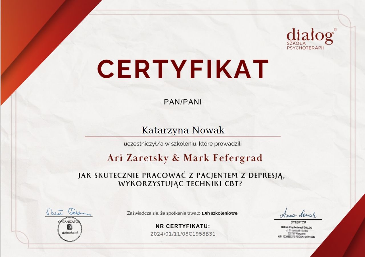 Jaki jest zakres porad oferowanych przez Katarzyna Nowak?Katarzyna Nowak to psycholog. Na podstawie swojego doświadczenia i wykształcenia Katarzyna Nowak oferuje usługi takie jak: Konsultacja psychologiczna, poradnictwo psychologiczne, interwencja kryzysowa, psychoedukacja.