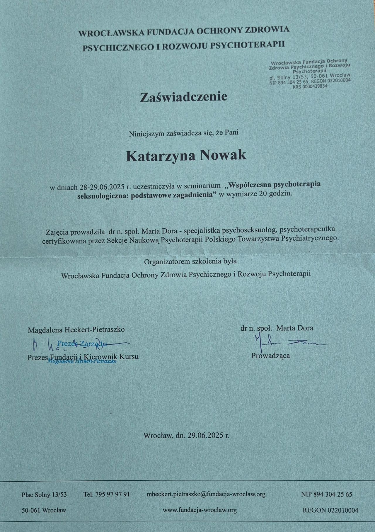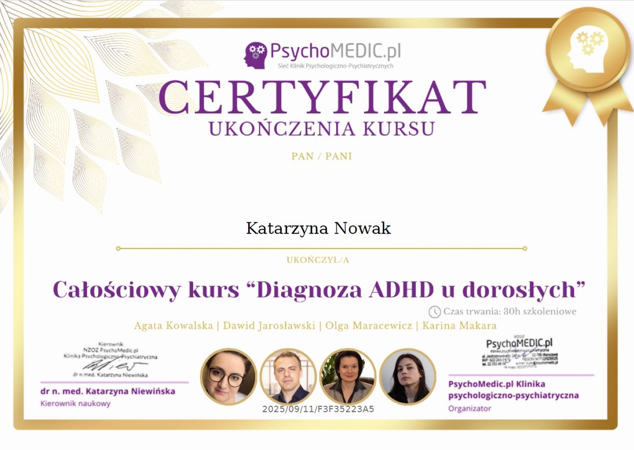 Jestem psychologiem w trakcie całościowego, czteroletniego kursu przygotowującego do uzyskania certyfikatu psychoterapeuty w nurcie integratywnym. Szkolenie odbywam we Wrocławskiej Fundacji Ochrony Zdrowia Psychicznego i Rozwoju Psychoterapii - ośrodku akredytowanym przez Polskie Towarzystwo Psychiatryczne.