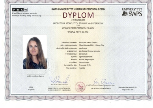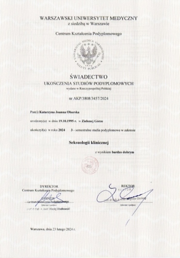 Nazywam się Katarzyna Obarska, jestem psychologiem i seksuologiem. Jestem absolwentką SWPS Uniwersytetu Humanistycznospołecznego w Warszawie oraz Warszawskiego Uniwersytetu Medycznego. Jestem w trakcie 4-letniego szkolenia psychoterapeutycznego w nurcie integracyjnym w Profesjonalnej Szkole Psychoterapii przy Instytucie Psychologii Zdrowia w Warszawie. Od 2019 roku jestem doktorantką psychologii w Szkole Doktorskiej Graduate School for Social Research, w Instytucie Psychologii PAN w Warszawie. Prowadzę sesje indywidualne, pracuję z osobami dorosłymi oraz młodzieżą od 15 roku życia. Prowadzę konsultacje oraz poradnictwo psychologiczne i seksuologiczne, a także psychoedukację. Jestem przyjazna osobom LGBT+. Swoją pracę poddaję regularnej superwizji. Pomagam w zrozumieniu i rozwiązaniu trudności natury psychicznej i seksualnej, które utrudniają codzienne funkcjonowanie. Klientów wspieram w radzeniu sobie z kryzysami życiowymi, w budowaniu wartościowych relacji, radzeniu sobie z lękiem i trudnymi emocjami. Pomagam w problemach związanych z dysfunkcjami seksualnymi i tożsamością seksualną. Zajmuję się pracą z osobami doświadczającymi trudności, wynikających z angażowania się w chemsex. Pracuję także z osobami uzależnionymi od zachowań (np. hazard, pornografia, gry), jak i od substancji psychoaktywnych. Korzystam z polityki redukcji szkód. Czerpię z nurtu humanistycznego i poznawczo-behawioralnego, skupiając się przede wszystkim na aktualnie przeżywanych trudnościach, dążeniu do poprawy jakości życia i budowaniu autentycznej relacji. Przez prawie 3 lata byłam nauczycielem akademickim na Uniwersytecie VIZJA (dawna Akademia Ekonomiczno-Humanistyczna) w Warszawie. Prowadziłam zajęcia dla studentów z zakresu psychologii uzależnień, seksuologii, psychometrii i statystyki. Przez ponad 3 lata pracowałam na stanowisku Research Data Manager w PredictWatch oraz RiskSense, firmach, które rozwijają technologie, wspierające w utrzymaniu abstynencji przez osoby uzależnione oraz pozwalające na wczesną predykcję nawrotów z wykorzystaniem urządzeń mobilnych. Jestem autorką i współautorką wielu publikacji naukowych, polsko- i anglojęzycznych. Swoją wiedzę i kompetencje poszerzam poprzez udział w międzynarodowych konferencjach, szkoleniach i warsztatach. Łączę pracę naukową z kliniczną, dzięki czemu wykorzystuję najnowszą wiedzę w praktycznej pracy z klientem.