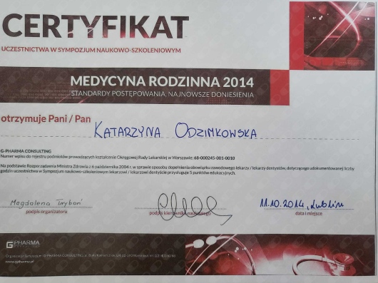 Jak Katarzyna Odzimkowska-Łata umawia wizyty?Katarzyna Odzimkowska-Łata używa kalendarza ZnanyLekarz, dlatego na stronie widzisz aktualne terminy. Wystarczy, że wybierzesz datę i godzinę, które odpowiadają Ci najbardziej. Umawianie wizyty jest darmowe, a tuż przed terminem wyślemy Ci przypomnienie.
