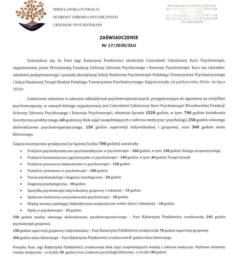 Moja ścieżka edukacyjna obejmuje studia magisterskie na wydziale filozofii, a także 4-letnie całościowe studia „Szkoły Wrocławskiej” (WFOZPiRP), akredytowane przez Polskie Towarzystwo Psychiatryczne. Posiadam również szereg dodatkowych certyfikatów, które pozwalają mi stale podnosić kwalifikacje i rozwijać nowe umiejętności.