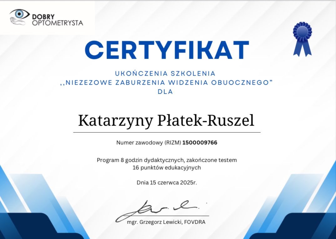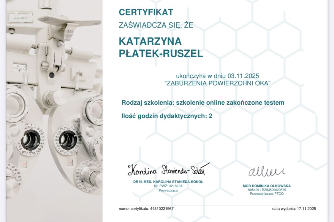 Ukończyłam studia z zakresu Optometrii na Politechnice Wrocławskiej, a następnie studia podyplomowe z rehabilitacji widzenia na Uniwersytecie Medycznym im. Karola Marcinkowskiego w Poznaniu. Połączenie solidnej wiedzy akademickiej z wieloletnią praktyką pozwala mi skutecznie wspierać pacjentów w poprawie jakości widzenia, co realnie wpływa na ich codzienny komfort życia.