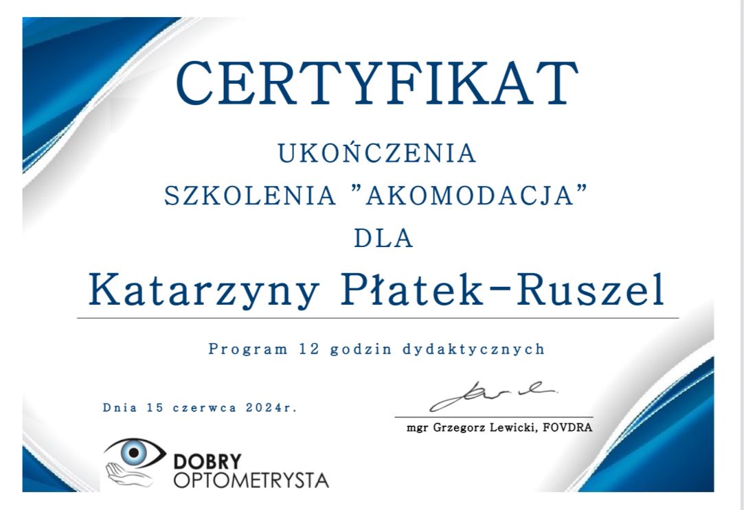 Jaki jest zakres porad oferowanych przez Katarzyna Płatek-Ruszel?Katarzyna Płatek-Ruszel to optometrysta. Na podstawie swojego doświadczenia i wykształcenia Katarzyna Płatek-Ruszel oferuje usługi takie jak: kontrola soczewek, Wizyta kontrolna po badaniu wzroku, dobór soczewek MiyoSmart, Badanie wzroku + dobór okularów, Terapia widzenia, pomiar ciśnienia wewnątrzgałkowego, trening wzrokowy przy zezie, trening wzrokowy w zaburzeniach widzenia obuocznego, Badanie wzroku u dorosłych, Badanie oraz dobór soczewek kontaktowych.