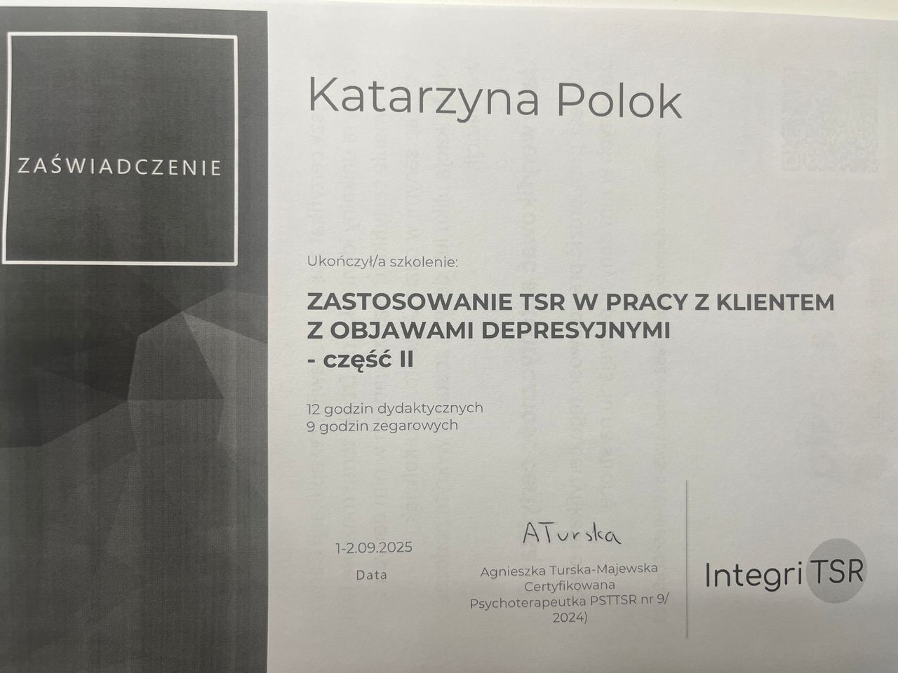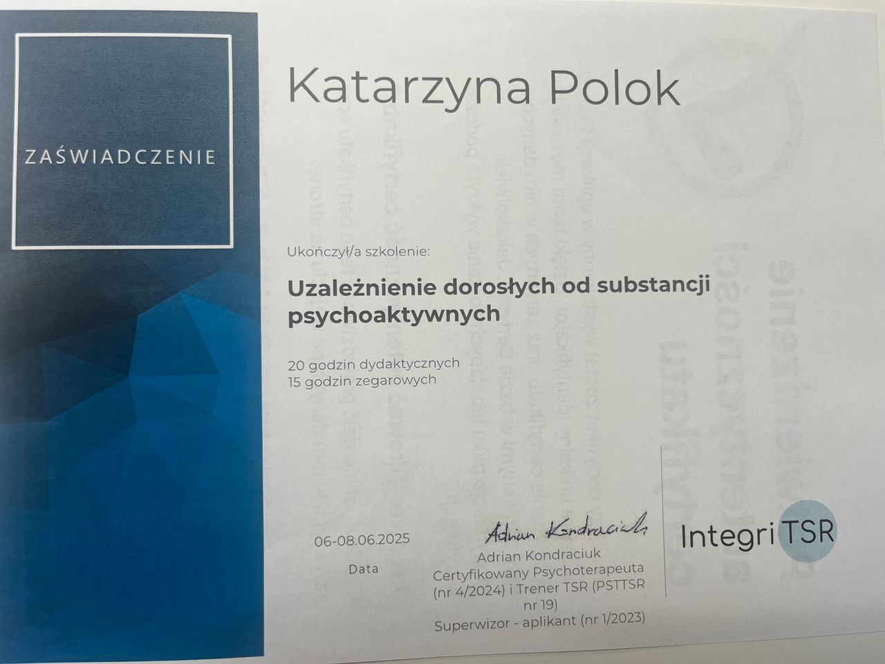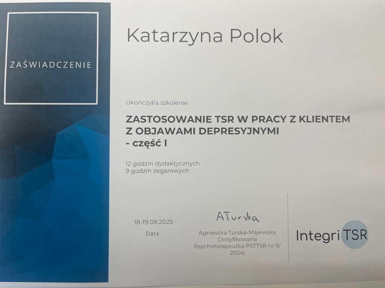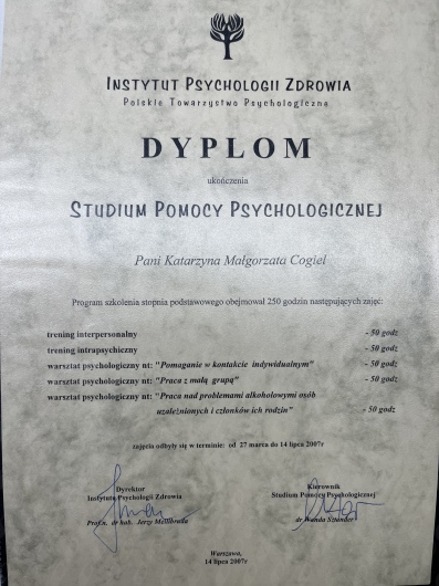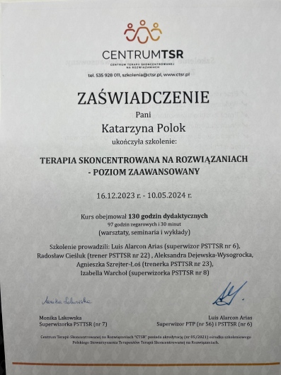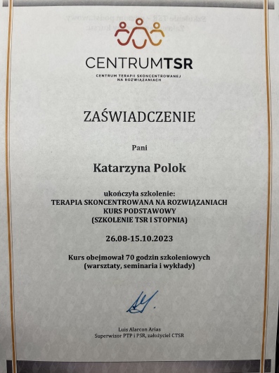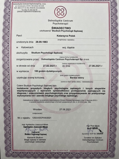 Jestem psychologiem, psychoterapeutą TSR w trakcie certyfikacji, psychologiem transportu oraz psychologiem uprawnionym do wykonywania badań do pozwolenia na broń. Ukończyłam jednolite 5-letnie studia magisterskie na Uniwersytecie Łódzkim o specjalności psychologia kliniczna, studia podyplomowe na kierunkach: psychologia transportu oraz trener zdolności poznawczych. Jestem absolwentką studium pomocy psychologicznej w Instytucie Psychologii Zdrowia w Warszawie oraz studium psychologii sądowej w Dolnośląskim Centrum Psychoterapii we Wrocławiu. Ukończyłam szkolenia z terapii skoncentrowanej na rozwiązaniu- poziom 1 i 2 i aktualnie nadal szkolę się w tym podejściu. Moje doświadczenie zawodowe obejmuje okres 17 lat podczas których pracowałam z osobami dorosłymi, młodzieżą a także z dziećmi w placówkach oświatowych oraz w poradni zdrowia psychicznego. W pracy diagnostycznej pracuję na najnowocześniejszej aparaturze dzięki czemu czas badania jest znacznie krótszy. Moja oferta skierowana jest do osób dorosłych zmagających się z różnego rodzaju trudnościami czy kryzysami.