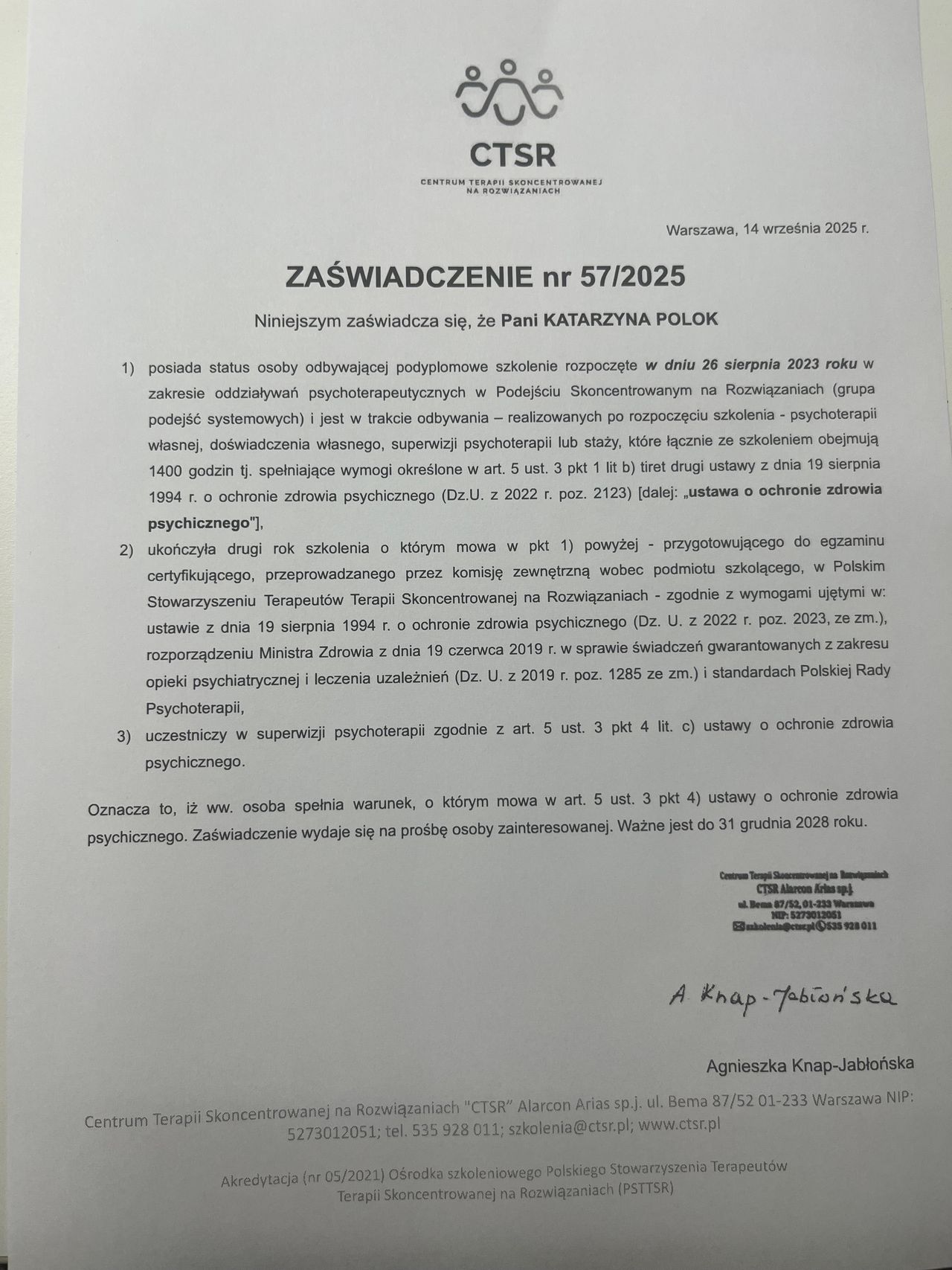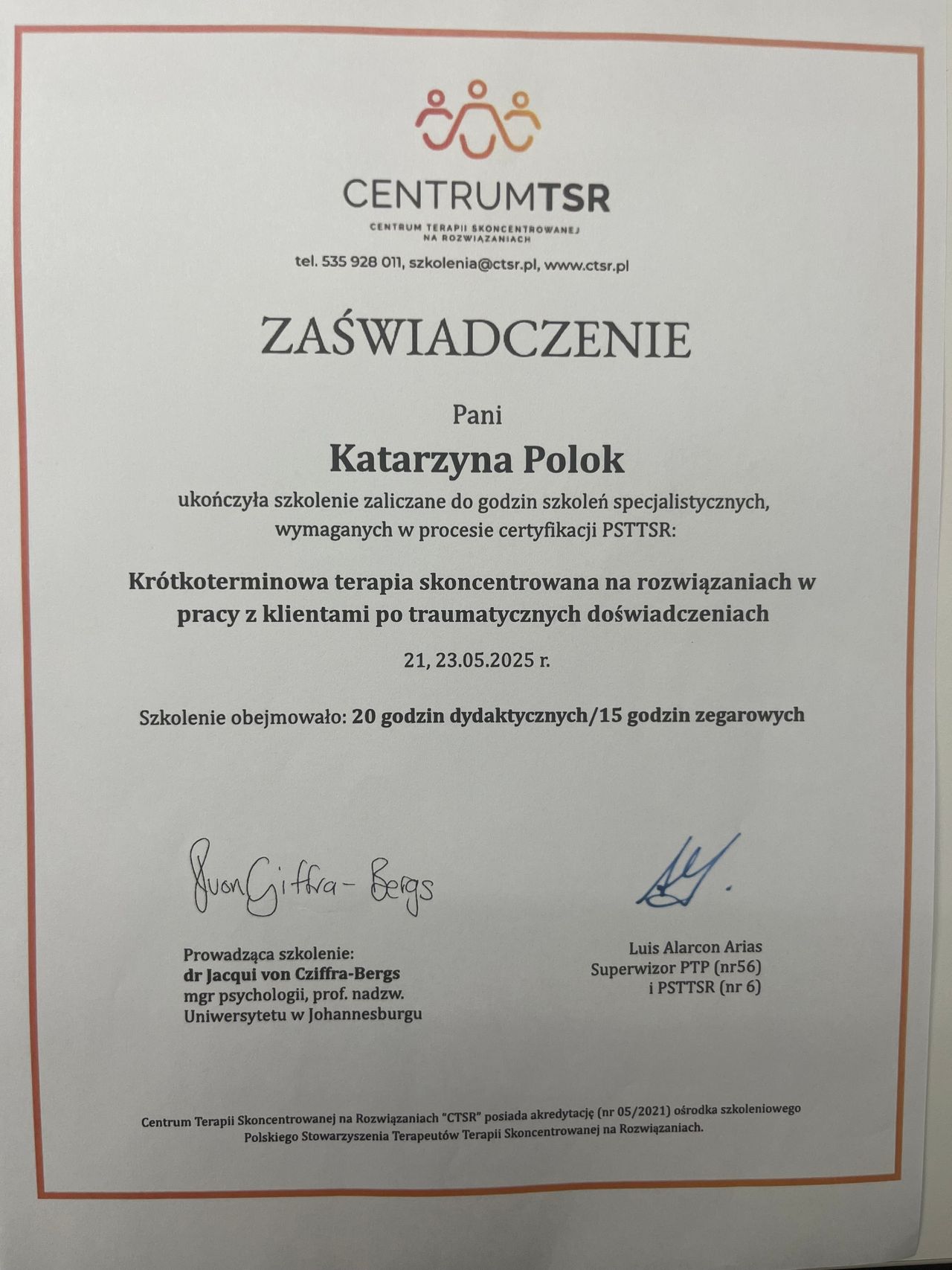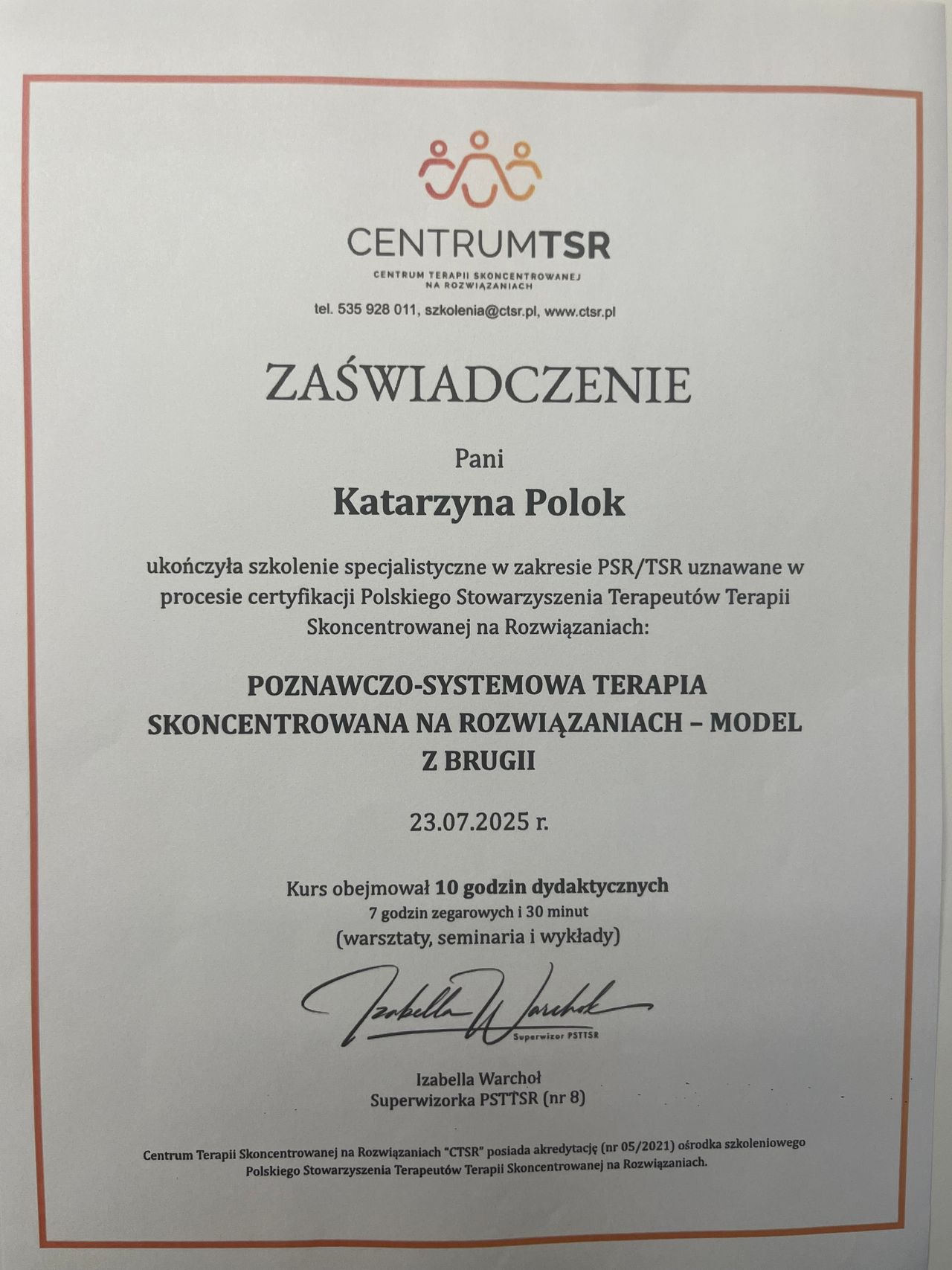 Jestem psychologiem, psychoterapeutą TSR w trakcie certyfikacji, psychologiem transportu oraz psychologiem uprawnionym do wykonywania badań do pozwolenia na broń. Ukończyłam jednolite 5-letnie studia magisterskie na Uniwersytecie Łódzkim o specjalności psychologia kliniczna, studia podyplomowe na kierunkach: psychologia transportu oraz trener zdolności poznawczych. Jestem absolwentką studium pomocy psychologicznej w Instytucie Psychologii Zdrowia w Warszawie oraz studium psychologii sądowej w Dolnośląskim Centrum Psychoterapii we Wrocławiu. Ukończyłam szkolenia z terapii skoncentrowanej na rozwiązaniu- poziom 1 i 2 i aktualnie nadal szkolę się w tym podejściu. Moje doświadczenie zawodowe obejmuje okres 17 lat podczas których pracowałam z osobami dorosłymi, młodzieżą a także z dziećmi w placówkach oświatowych oraz w poradni zdrowia psychicznego. W pracy diagnostycznej pracuję na najnowocześniejszej aparaturze dzięki czemu czas badania jest znacznie krótszy. Moja oferta skierowana jest do osób dorosłych zmagających się z różnego rodzaju trudnościami czy kryzysami.