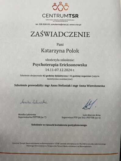 Czy Katarzyna Polok przyjmuje online, bez konieczności pojawiania się w placówce?Tak, Katarzyna Polok oferuje konsultacje online. Wybierz opcję „konsultacja online” przy umawianiu wizyty, a zobaczysz dostępne terminy.