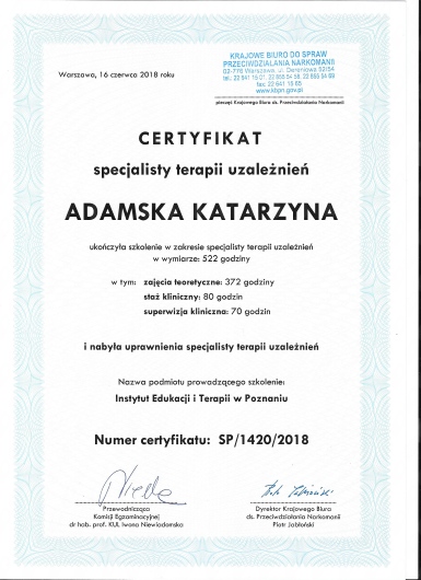 Nieustannie podnoszę swoje kwalifikacje biorąc udział w szkoleniach i konferencjach. Swoją pracę poddaję regularnej superwizji u superwizorów rekomendowanych przez Krakowskie Centrum Psychodynamiczne oraz Krajowe Biuro ds. Przeciwdziałania Narkomanii.