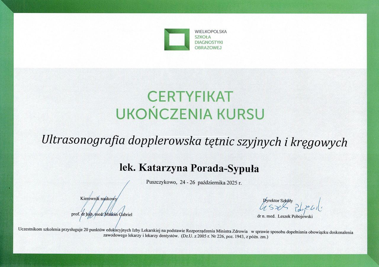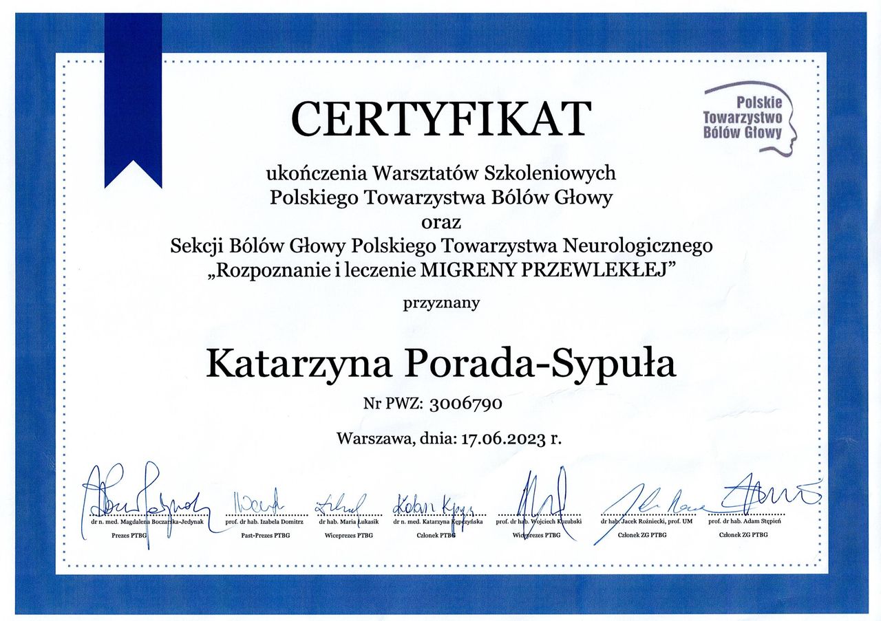 W 2023r otrzymałam certyfikat umożliwiający leczenie toksyną botulinową w migrenie przewlekłej. Szczególnym zainteresowaniem darzę powszechny, a zarazem niedoszacowany, problem bólów głowy, w tym migreny, jej przyczyn, a przede wszystkim możliwych terapii, z uwzględnieniem najnowocześniejszych metody leczenia w m.in toksyną botulinową czy przeciwciałami monoklonalnymi.