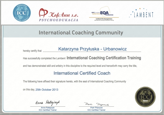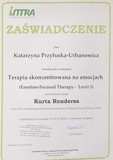 - szkolenie "Emotion-Focused Therapy" ("Terapia skoncentrowana na emocjach") prowadzone przez Kurta Rendersa - poziom 1 i 2.