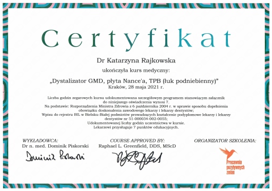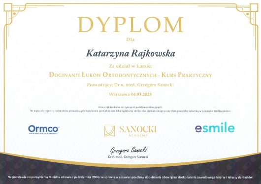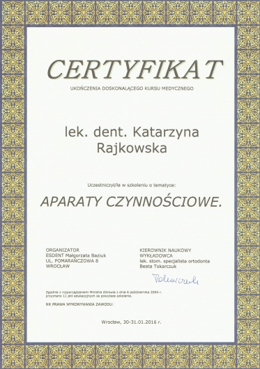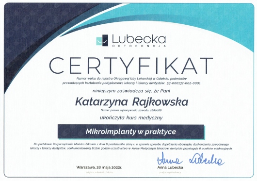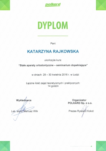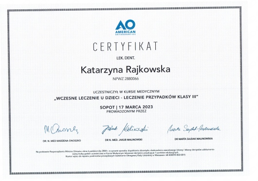 Jaki jest zakres porad oferowanych przez Katarzyna Rajkowska?Katarzyna Rajkowska to stomatolog. Na podstawie swojego doświadczenia i wykształcenia Katarzyna Rajkowska oferuje usługi takie jak: konsultacja ortodontyczna, ortodoncja, kontrola aparatu stałego, kontrola aparatu zdejmowanego.