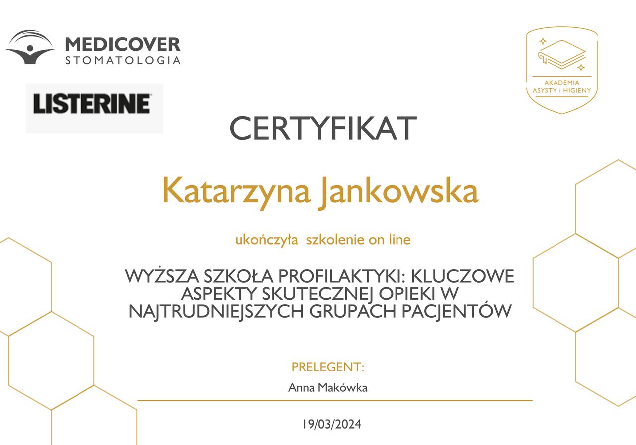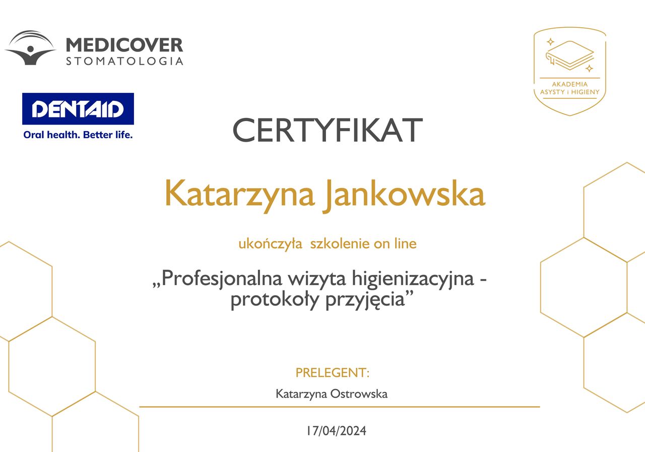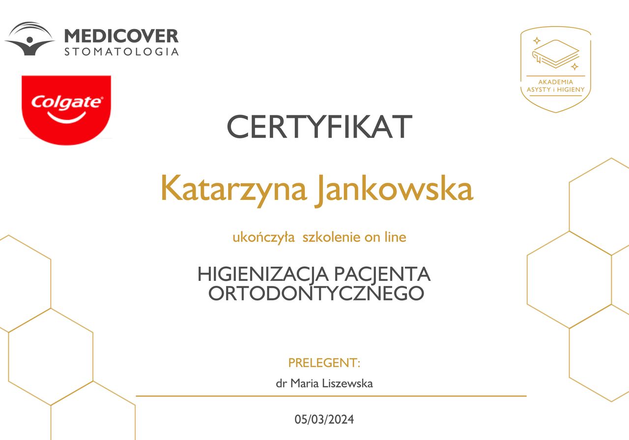 Regularnie uczestniczę w kursach i szkoleniach z zakresu higieny, profilaktyki i wybielania, ponieważ zależy mi na ciągłym rozwoju i pracy zgodnej z aktualnymi standardami. Posługuję się językiem angielskim na poziomie średnio zaawansowanym.