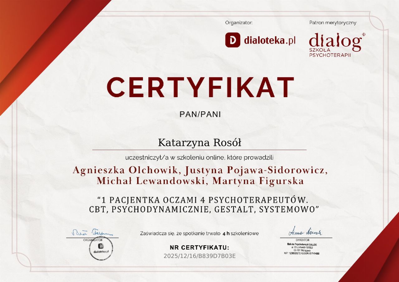 Spotkania odbywają się stacjonarnie w gabinecie w Tarnowskich Górach lub online przez Google Meet.