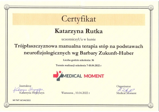 Dyplom mgr fizjoterapii uzyskałam w Społecznej Akademii Nauk w Warszawie na kierunku Fizjoterapia.