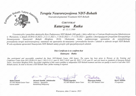 Pani Kasia pomogła mojemu synowi w rozwoju ruchowym, po trwającym 4 miesiące leczeniu poważnej dysplazji za pomocą ortezy. Kiedy uporaliśmy się z dysplazją i skończyliśmy leczenie ortezą okazało się, że syn ma spore zaległości w rozwoju ruchowym a dodatku nie garnie się do ruchu i nie samodzielnie nie nadrabia zaległości. Dzięki cotygodniowym wizytom Pani Kasi, prowadzonym wg metody Bobath, wzmocnił mięśnie, wreszcie opanował pełzanie a potem zaczął raczkować. Spotkania były prowadzone z dużą cierpliwością i empatią. Dziękujemy i polecamy!