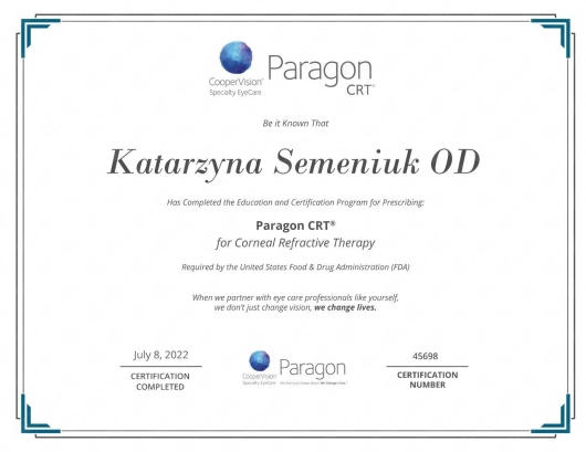 Jaki jest zakres porad oferowanych przez Katarzyna Semeniuk?Katarzyna Semeniuk to optometrysta. Na podstawie swojego doświadczenia i wykształcenia Katarzyna Semeniuk oferuje usługi takie jak: Badanie wzroku u dorosłych, badanie wzroku u dzieci, dobór soczewek kontaktowych miękkich, kontrola soczewek, Topografia rogówki + Pachymetria, Konsultacja optometryczna, soczewki ortokorekcyjne.