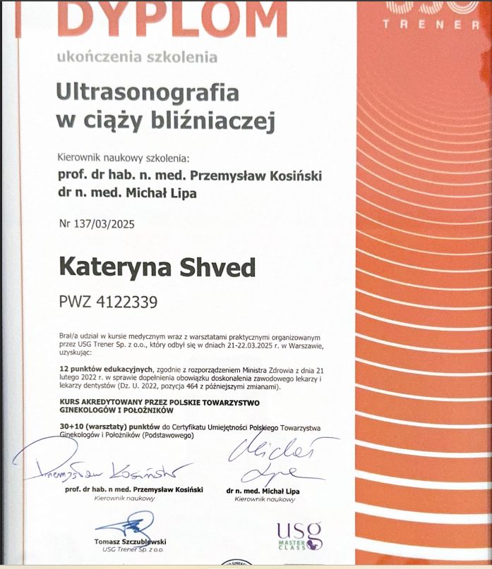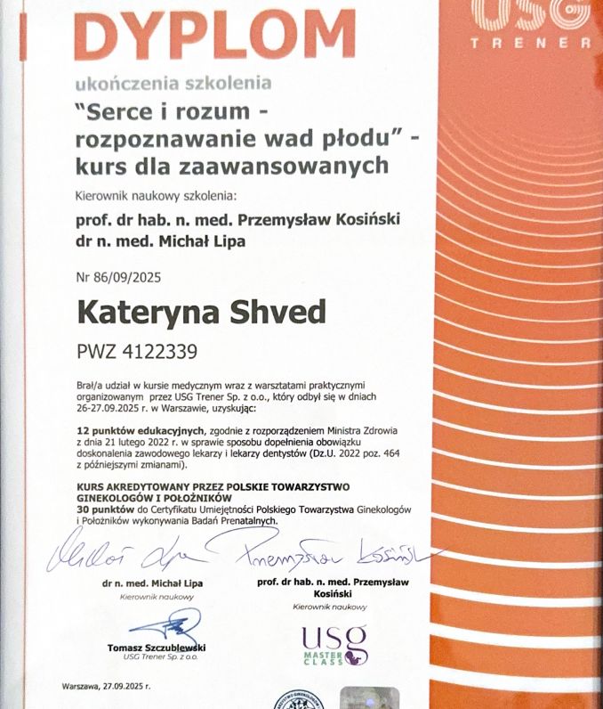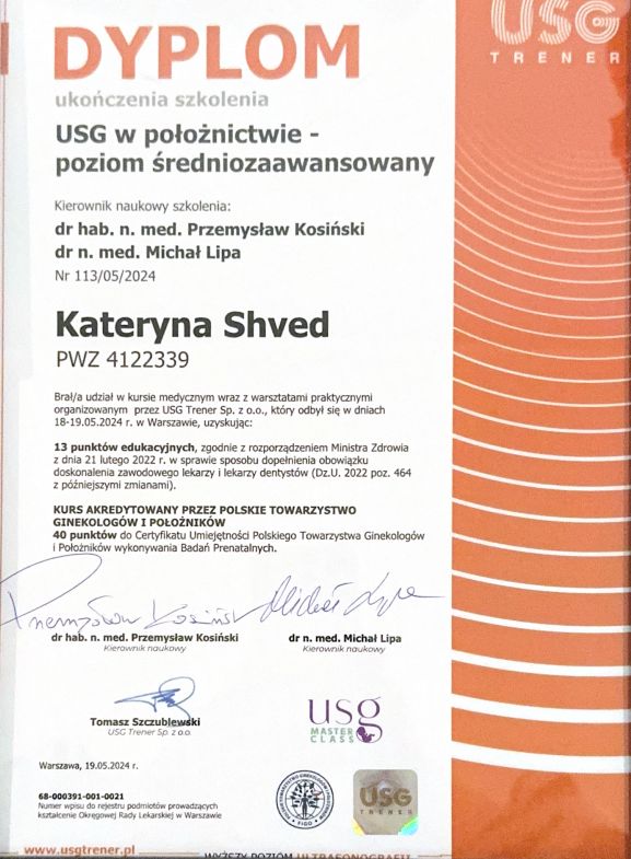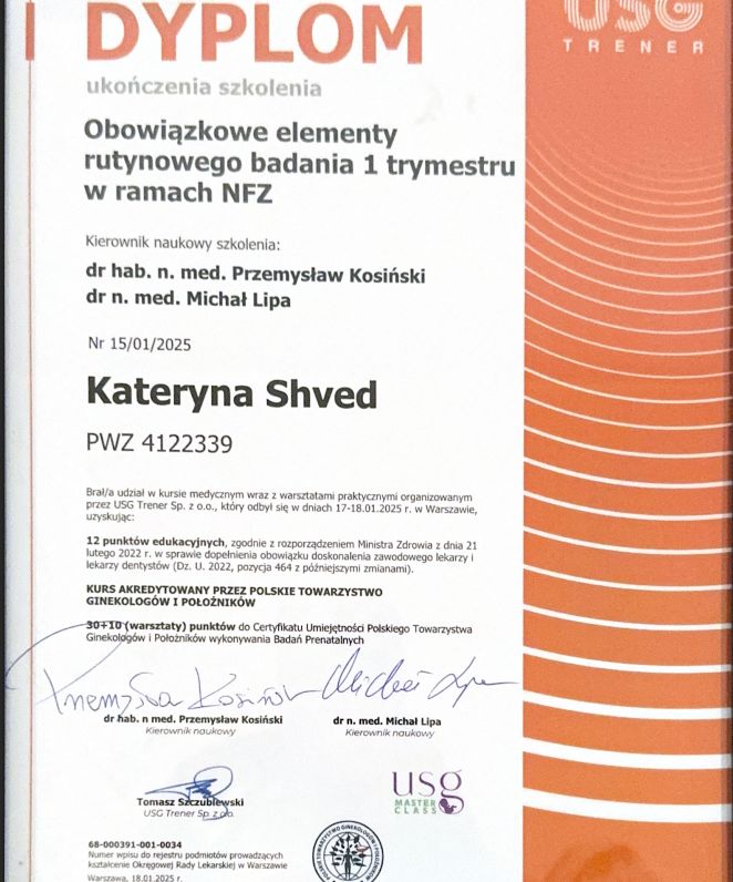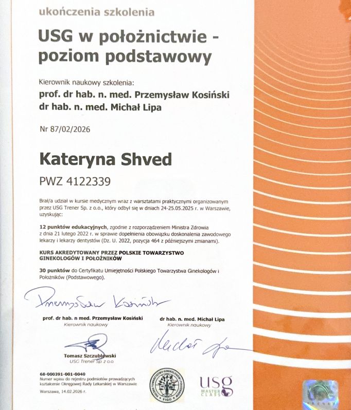 Jaki jest zakres porad oferowanych przez Katarzyna Shved?Katarzyna Shved to w trakcie specjalizacji (ginekolog). Na podstawie swojego doświadczenia i wykształcenia Katarzyna Shved oferuje usługi takie jak: konsultacja ginekologiczna, założenie wkładki domacicznej Mirena, konsultacja ginekologiczna + USG, konsultacja ginekologiczna + USG + cytologia, konsultacja ginekologiczna + USG kontrolne ciąży.