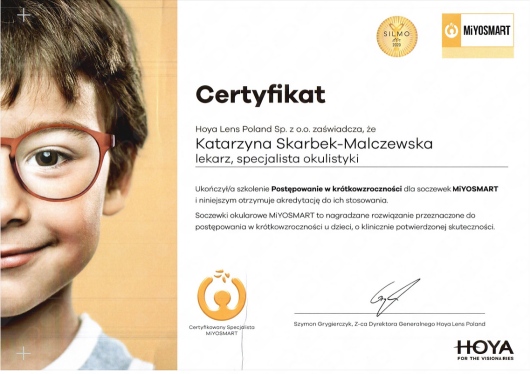 kontrolą krótkowzroczności u dzieci – od 2022 roku posiadam certyfikat specjalisty doboru soczewek MiYOSMART, które skutecznie spowalniają progresję tej wady,