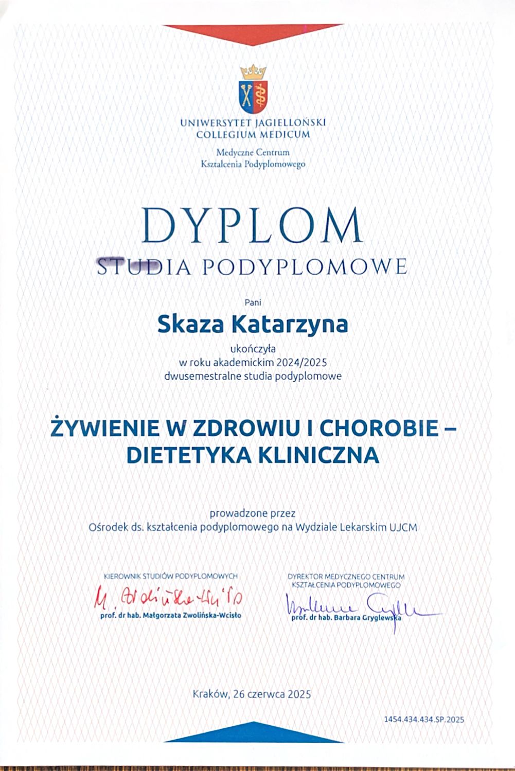 Jestem certyfikowanym elektroakupunkturzystą, odbyłam szereg kursów w tym kierunku, co umożliwia mi wykonywanie diagnostyki metodą Vega Test. Ukończyłam dietetykę w Akademii Dietetyki, posiadam dyplom z ziołolecznictwa, ukończyłam szkołę naturoterapii oraz dietetykę kliniczną na Uniwersytecie Jagiellońskim.