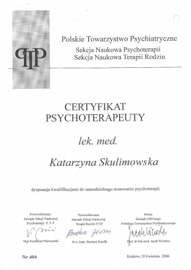 Pani sprawia wrażenie jakby irytowało ją to, że ktoś się musi zastanowić, że może czegoś nie wiedzieć od razu. Niezbyt miałem możliwość bycia wysłuchanym i doprecyzowania niektórych spraw, w wyniku czego Pani wystawiła jedną z diagnoz na podstawie własnych domysłów. Odczułem podczas wizyt brak zrozumienia i wręcz niechęć do słuchania tego, co miałem do powiedzenia, więc nie mogę Pani Skulimowskiej polecić.