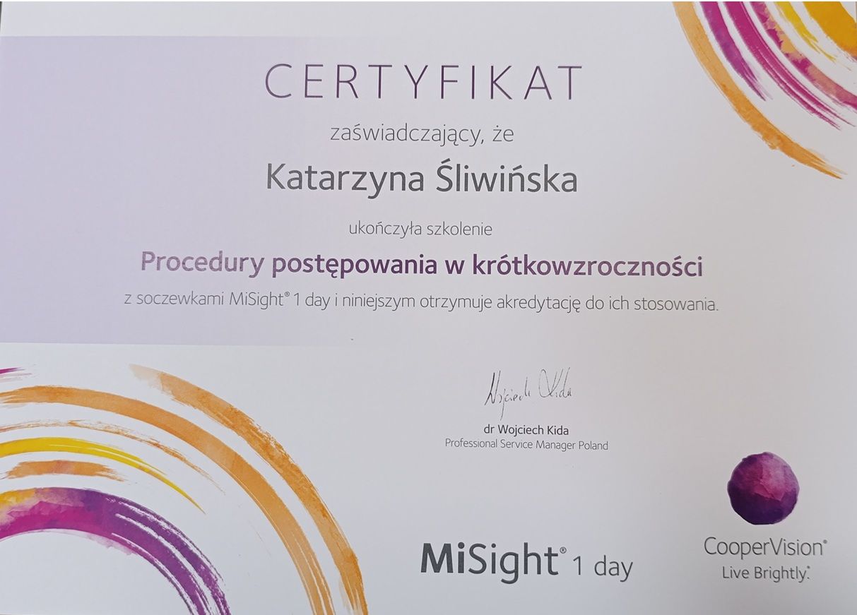 Jestem absolwentką Politechniki Wrocławskiej. Tytuł optometrysty uzyskałam w 2014r. Od wielu lat związana jestem z gdańskimi salonami optycznymi. Zajmuję się doborem korekcji okularowej i miękkich soczewek kontaktowych u dorosłych i młodzieży powyżej 16 r.ż. W zakresie moich zainteresowań znajduje się optometria kliniczna i kontaktologia. Aktywnie podnoszę swoje kwalifikacje zawodowe uczestnicząc w kursach szkoleniowych i konferencjach naukowych.