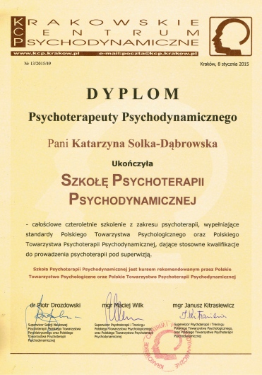 Jaki jest zakres porad oferowanych przez Katarzyna Solka-Dąbrowska?Katarzyna Solka-Dąbrowska to psycholog, psychoterapeuta. Na podstawie swojego doświadczenia i wykształcenia Katarzyna Solka-Dąbrowska oferuje usługi takie jak: psychoterapia indywidualna, konsultacja psychoterapeutyczna, Konsultacja psychologiczna, psychoterapia psychodynamiczna, Konsultacja psychologiczna online.