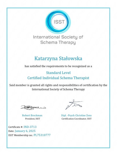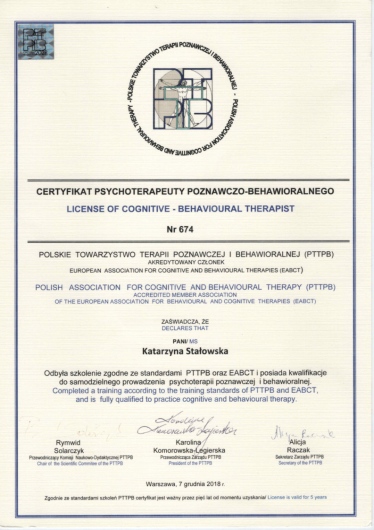 Pani Katarzyna jest bardzo sympatyczną psychoterapeutką. Uważnie słucha, proponuje rozwiązania, np. sposoby polepszenia komunikacji czy radzenia sobie ze stresem. Dzięki Pani Katarzynie jestem mniej zestresowana i lepiej radzę sobie w sytuacjach konfliktowych lub stresujących. Inaczej patrzę na różne kwestie.