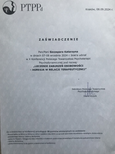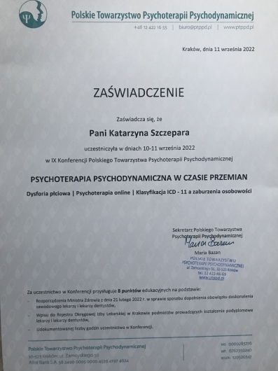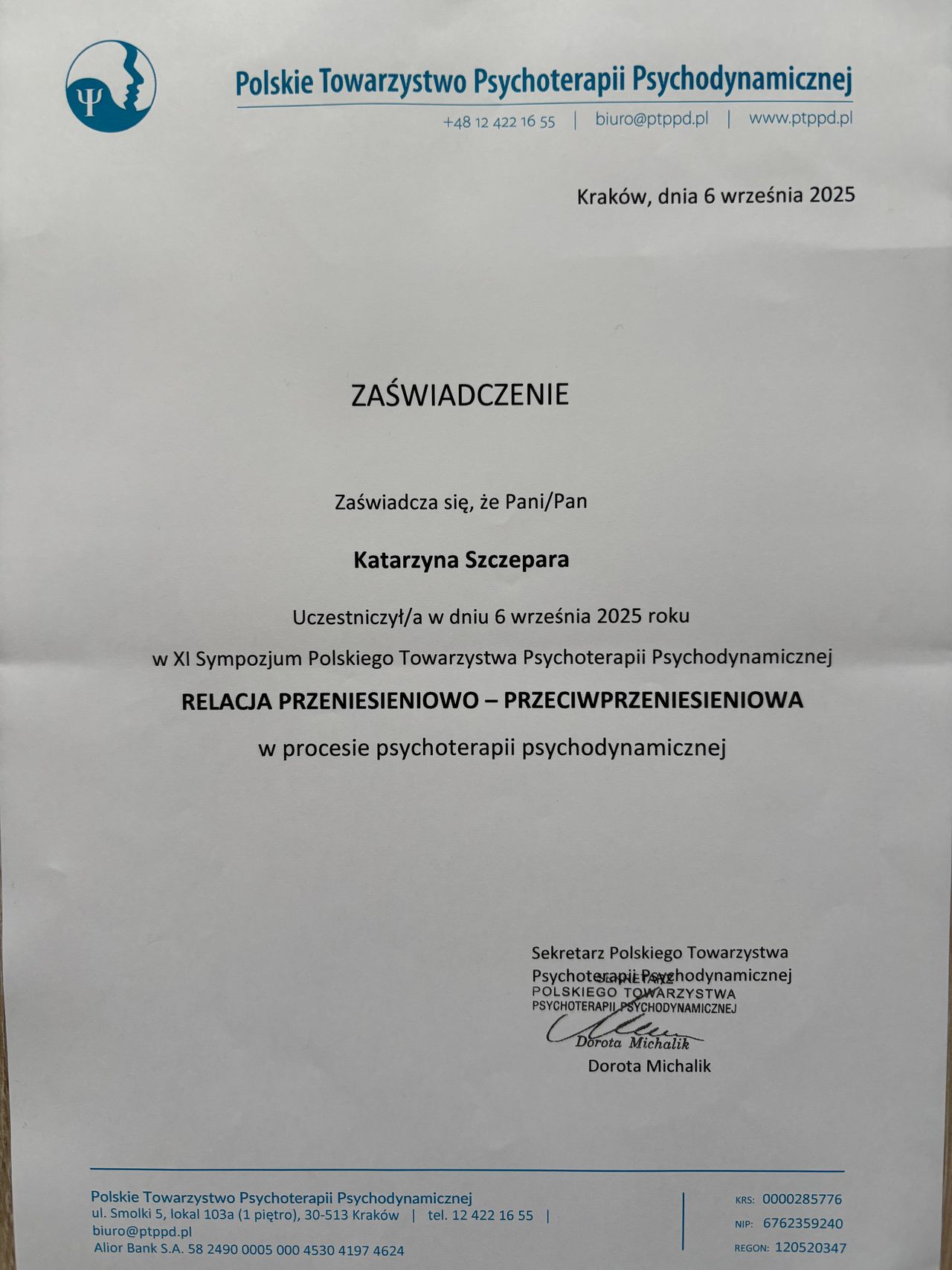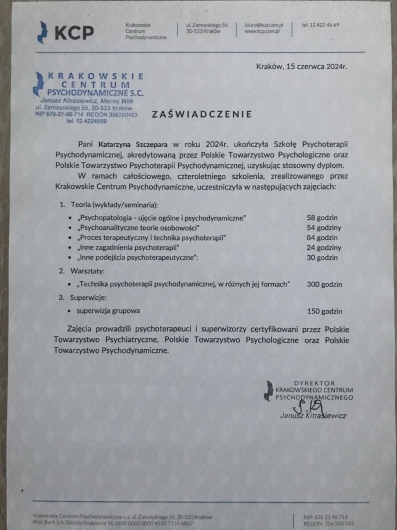 - ukończyłam całościowe czteroletnie szkolenie psychoterapeutyczne w Krakowskim Centrum Psychodynamicznym, które przygotowuje mnie do uzyskania certyfikatu Polskiego Towarzystwa Psychologicznego. Krakowskie Centrum Psychodynamiczne jest instytucją rekomendowaną przez Polskie Towarzystwo Psychologiczne oraz Polskie Towarzystwo Psychoterapii Psychodynamicznej