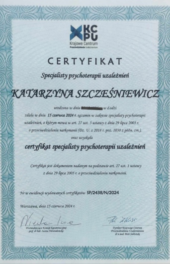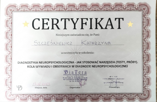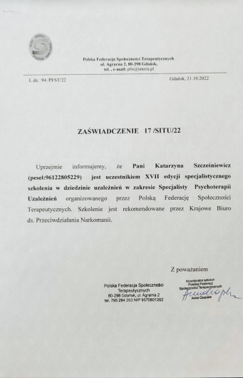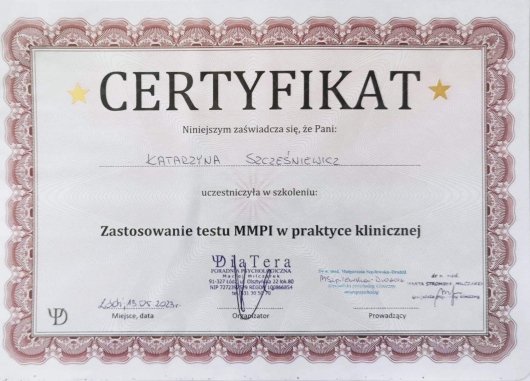 Regularnie poszerzam swoją wiedzę i umiejętności biorąc udział w szkoleniach. Jestem pod stałą superwizją.