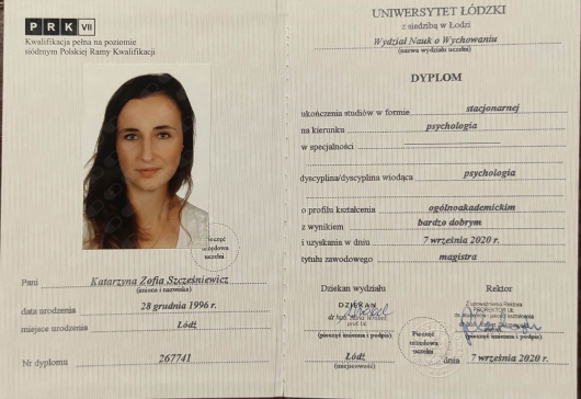 Ukończyłam studia magisterskie, specjalność psychologia zdrowia i kliniczna na Uniwersytecie Łódzkim. Dalsze kształcenie kontynuowałam w