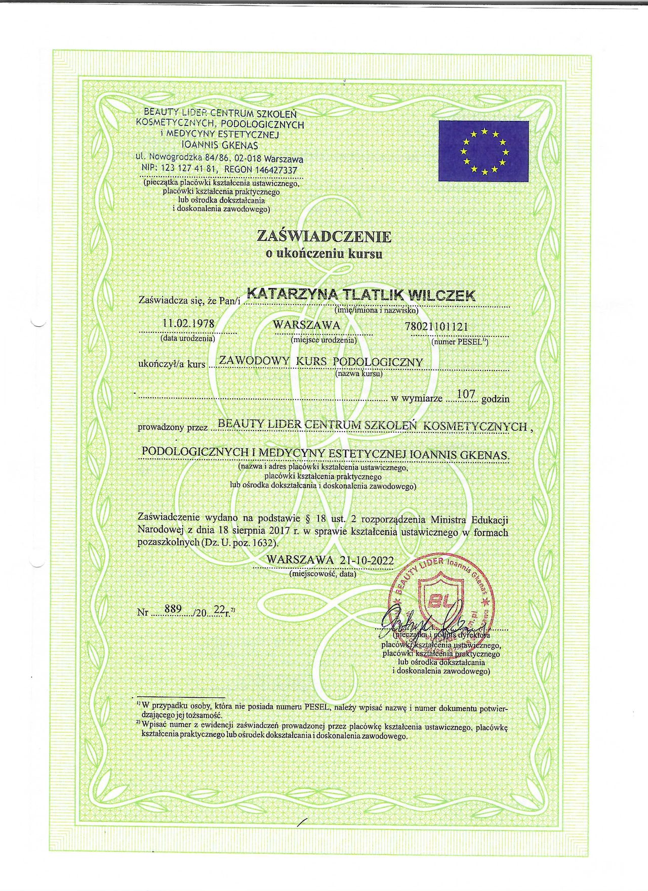 jestem podologiem współpracującym z kliniką Venamed w Warszawie, gdzie odpowiadam za koordynację świadczenia usług podologicznych. Ukończyłam studia pierwszego stopnia na Uniwersytecie Warszawskim na kierunku Profilaktyka Społeczna i Resocjalizacja, zdobywając również tytuł Zawodowego Opiekuna Medycznego oraz uprawnienia do wykonywania zabiegów podologicznych.