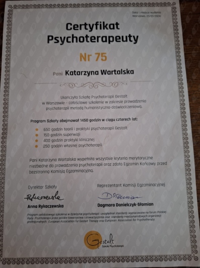 Jaki jest zakres porad oferowanych przez Katarzyna Wartalska?Katarzyna Wartalska to psycholog, psychoterapeuta certyfikowany. Na podstawie swojego doświadczenia i wykształcenia Katarzyna Wartalska oferuje usługi takie jak: konsultacja psychoterapeutyczna, konsultacja psychoterapeutyczna (pierwsza wizyta), terapia par, konsultacja online.