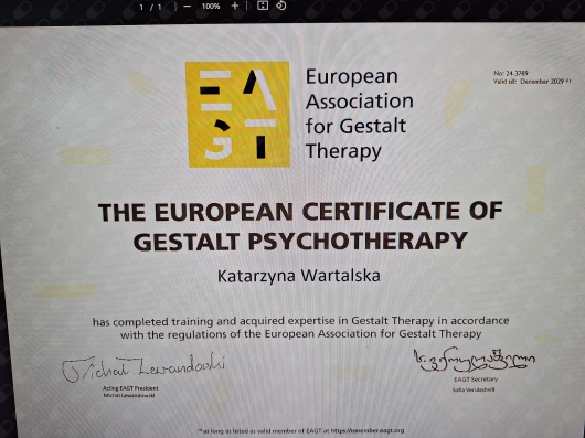 Ciągle podnoszę swoje kwalifikacje w zakresie umiejętności terapeutycznych i samorozwoju min.: w temacie: pracy z osobami w procesach uzależnieniowych z perspektywy Gestalt oraz pracy z osobami LGBTQ + . Uczestniczyłam także w szkoleniach pomocowych zorganizowanych przez fundację ” Życie warte jest rozmowy” w zakresie pomocy osobom w kryzysie samobójczym.