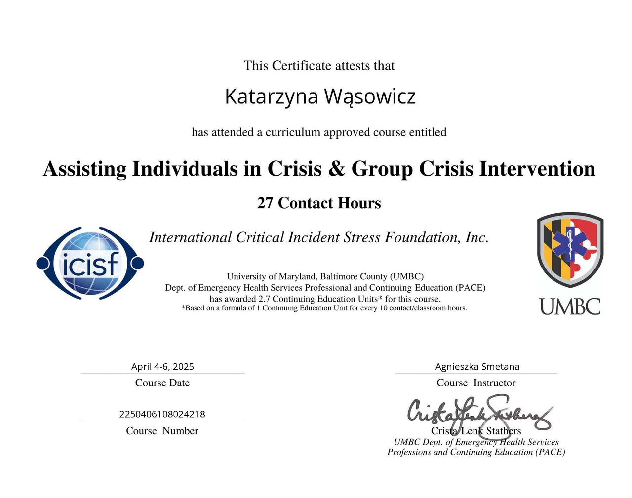 "Assisting Individuals in Crisis & Group Crisis Intervention" organizowane przez International Critical Incident Stress Foundation (ICISF) we współpracy z University of Maryland, Baltimore County (UMBC).