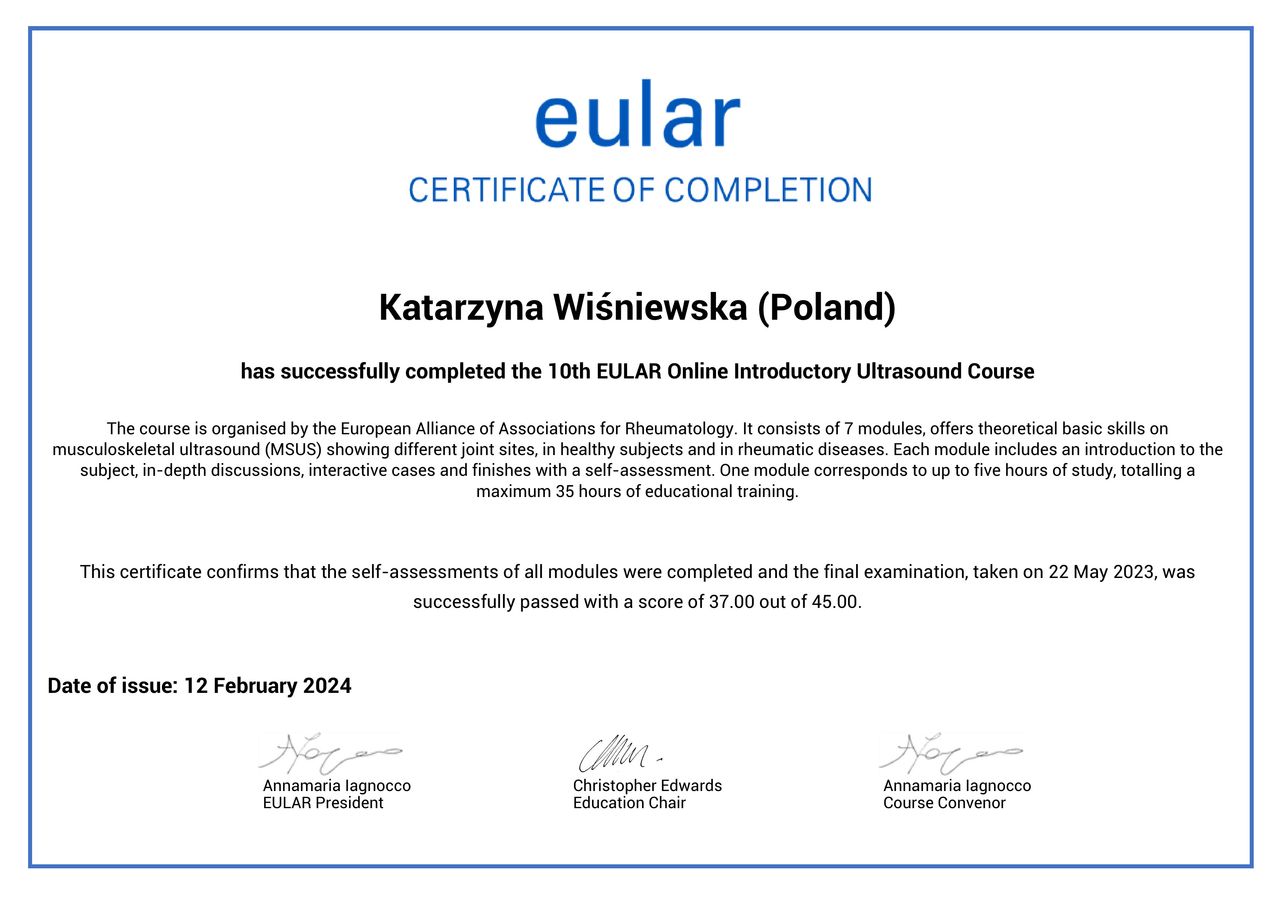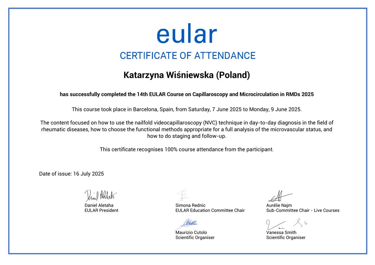 Jestem członkinią Polskiego Towarzystwa Reumatologicznego. Od początku swojej kariery zawodowej poszerzam swoją wiedzę teoretyczną oraz umiejętności praktyczne aktywnie uczestnicząc w licznych sympozjach, konferencjach oraz szkoleniach dotyczących m.in. USG narządu ruchu. W 2022 r. uzyskałam tytuł doktora nauk medycznych, broniąc pracę doktorską, która koncentrowała się na czynnikach ryzyka zdarzeń sercowo – naczyniowych u chorych na reumatoidalne zapalenie stawów.