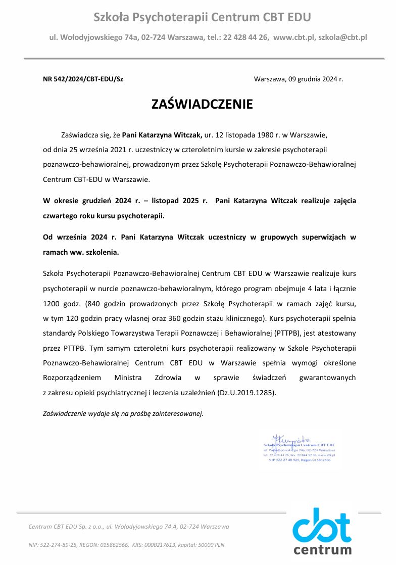 Gdzie Katarzyna Witczak ma swój gabinet?Katarzyna Witczak nie ma określonego adresu gabinetu. Możliwe, że Katarzyna Witczak przyjmiuje tylko online lub nie chce podawać dokładnego adresu.